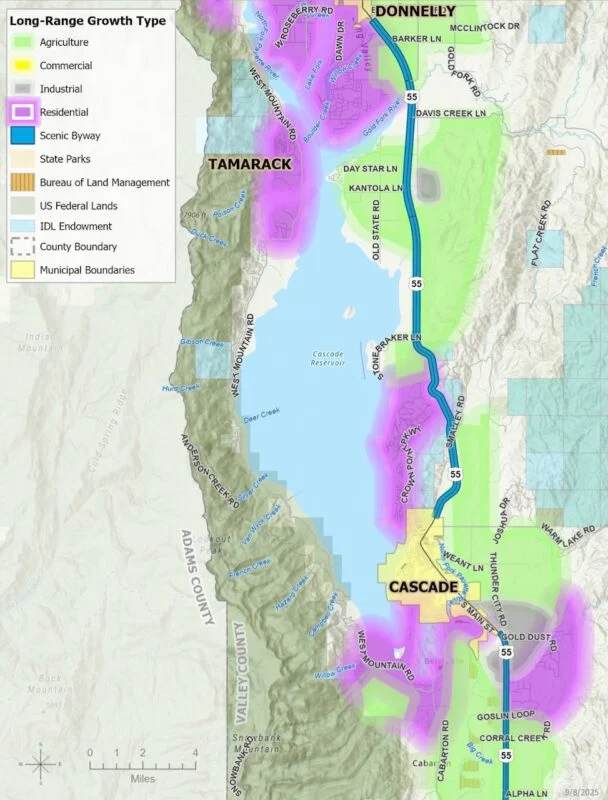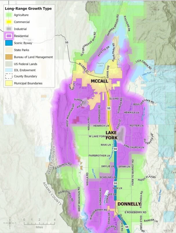 The maps show mostly residential development surrounding McCall, except for a strip of commercial development along Idaho 55 between the city and Lake Fork. Most of the land around the northern part of is designated as “agricultural” in the draft maps.