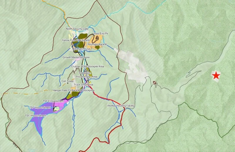 The Annie Creek Property (shown with red star) is about three miles east of Perpetua Resources’ Stibnite mine. Map: Via Payette National Forest